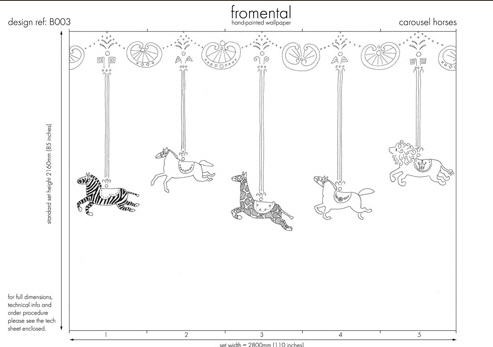 How cute is this wallpaper? It is some of the nicest wallpaper I have seen for children's rooms. It is from a British company called Fromental. Established in 2005, Fromental produces a beautiful line of hand painted wallpapers. The Company is headed by Tim Butcher, former seven years Creative Director of world-renowned hand-painted Chinoiserie house de Gournay. Their latest line is called "Brainchild" (I love that name), and is a mini collection of 3 fun layouts for children's rooms. The pictures show the colorways available in each series. The schematic shows how the panels go together to create a mural on the wall.